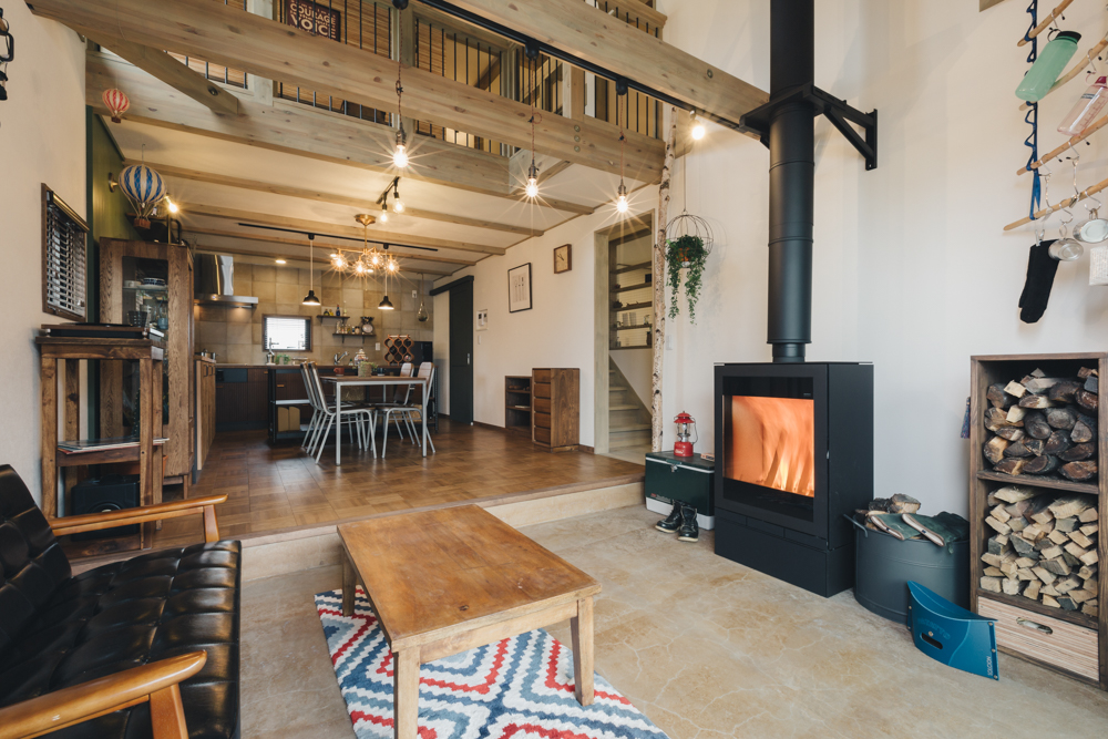 薪ストーブと吹き抜けリビングがあるインダストリアルテイストな家 BinO LOAFER