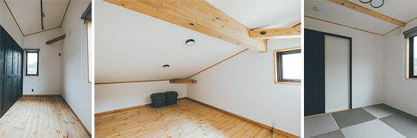 勾配天井の小屋裏は、大人も子どももワクワクしてしまう秘密基地。 子どもの遊び場として使ったり、映画や音楽を楽しんだり、趣味の隠れ部屋としても。もちろん季節物の衣類や生活道具、記念品などをまとめて収納しておけば、家の中はいつでもキレイをキープできます。